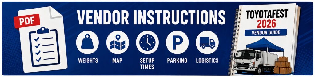 Welcome to the TOYOTAFEST 2026 Vendors Portal – your one-stop station for all event-related resources and important updates. Please review the information below carefully and use the provided links to complete any required actions ahead of the event.